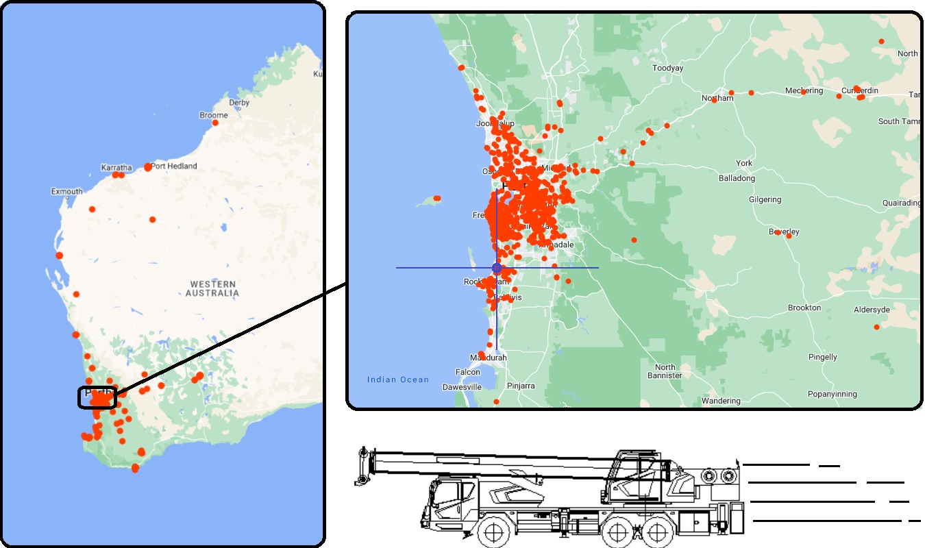 We are based in Kwinana with a 700m² yard and 150m² workshop, traveling throughout the entire perth metro area for small jobs, and the entire state of Western Australia for projects. the red dots give you an ideas of the area we cover.